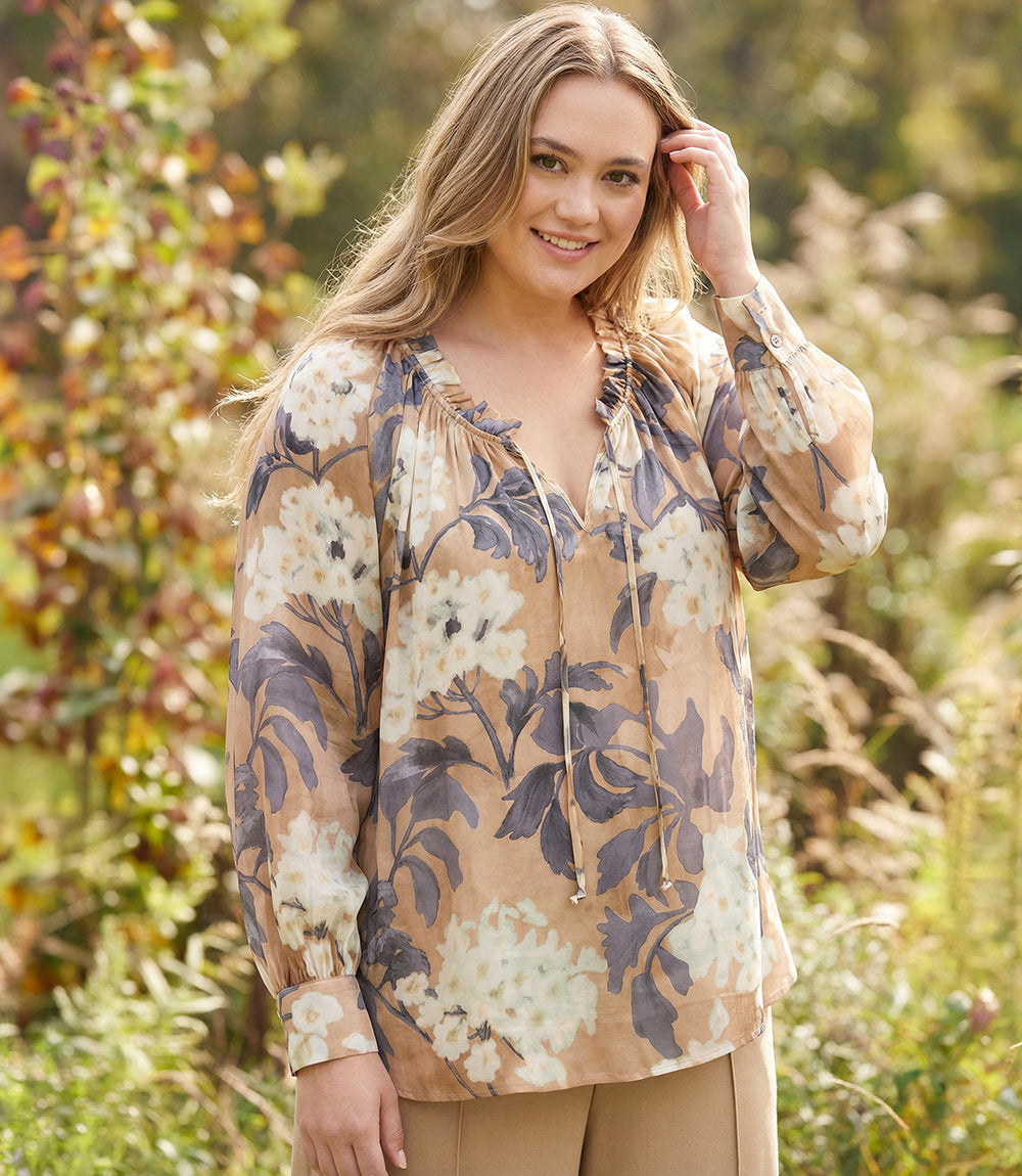 Plus Size Long Sleeve Ruffle Neck Peasant Top