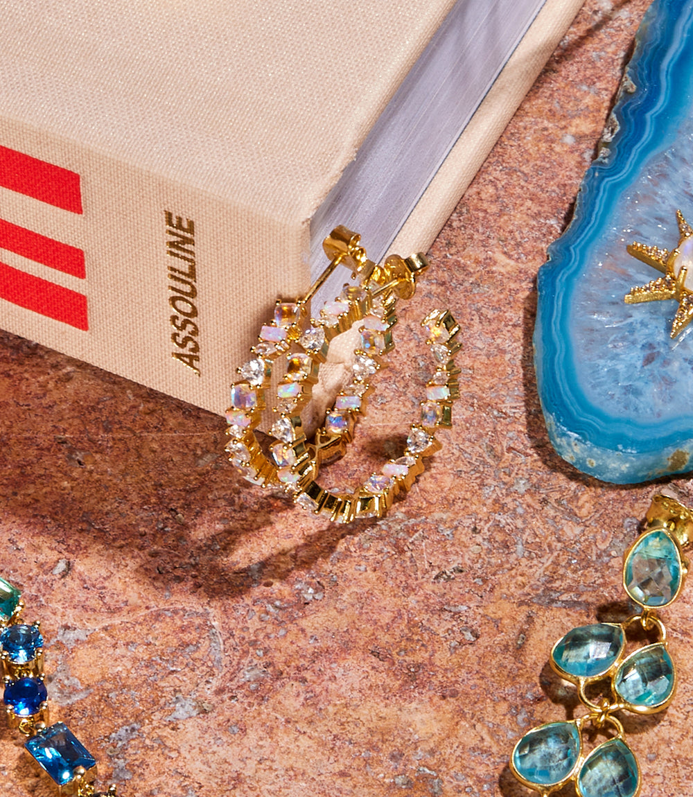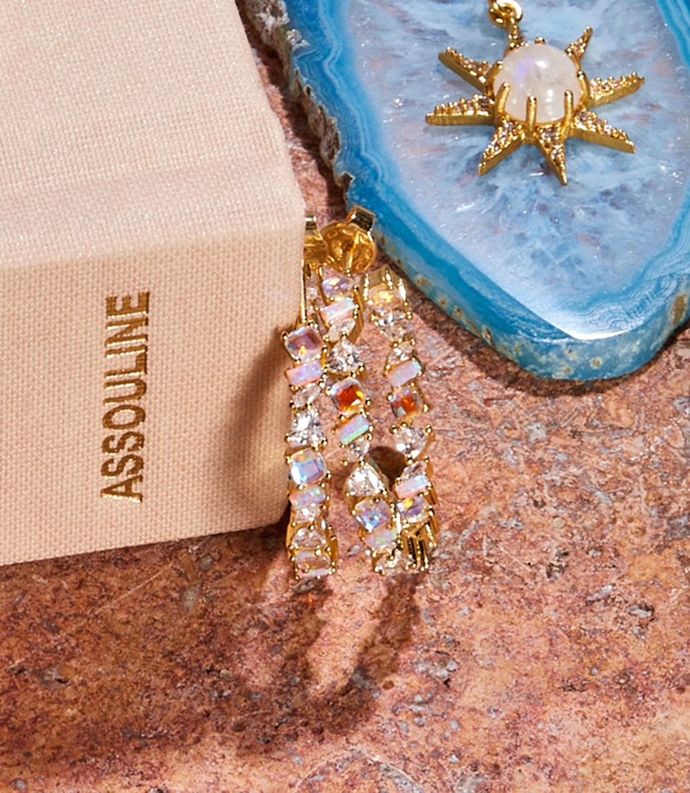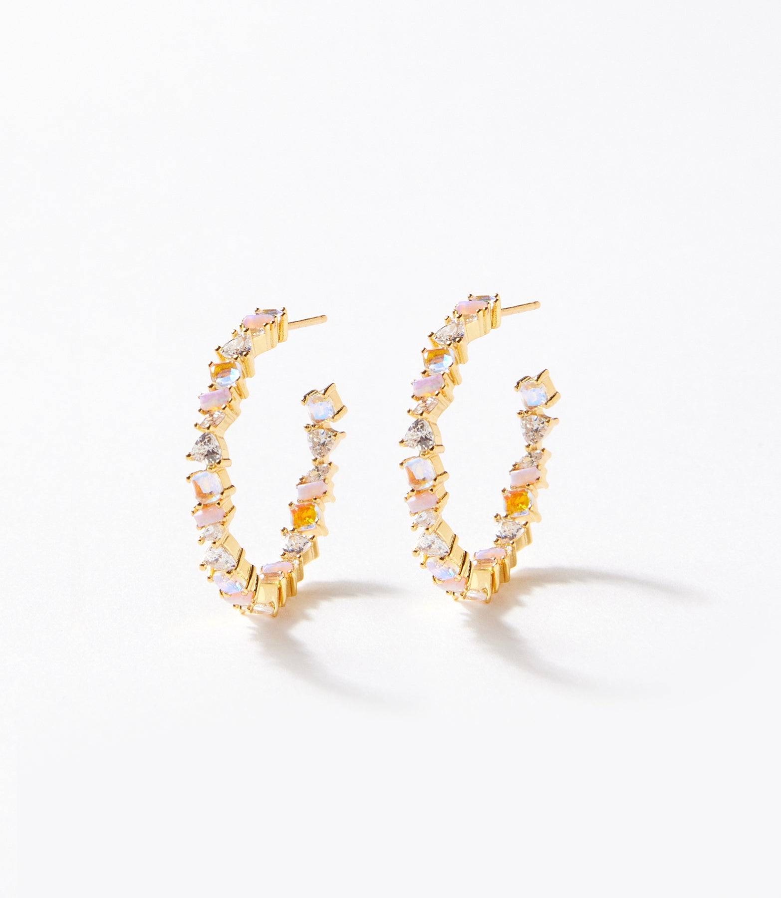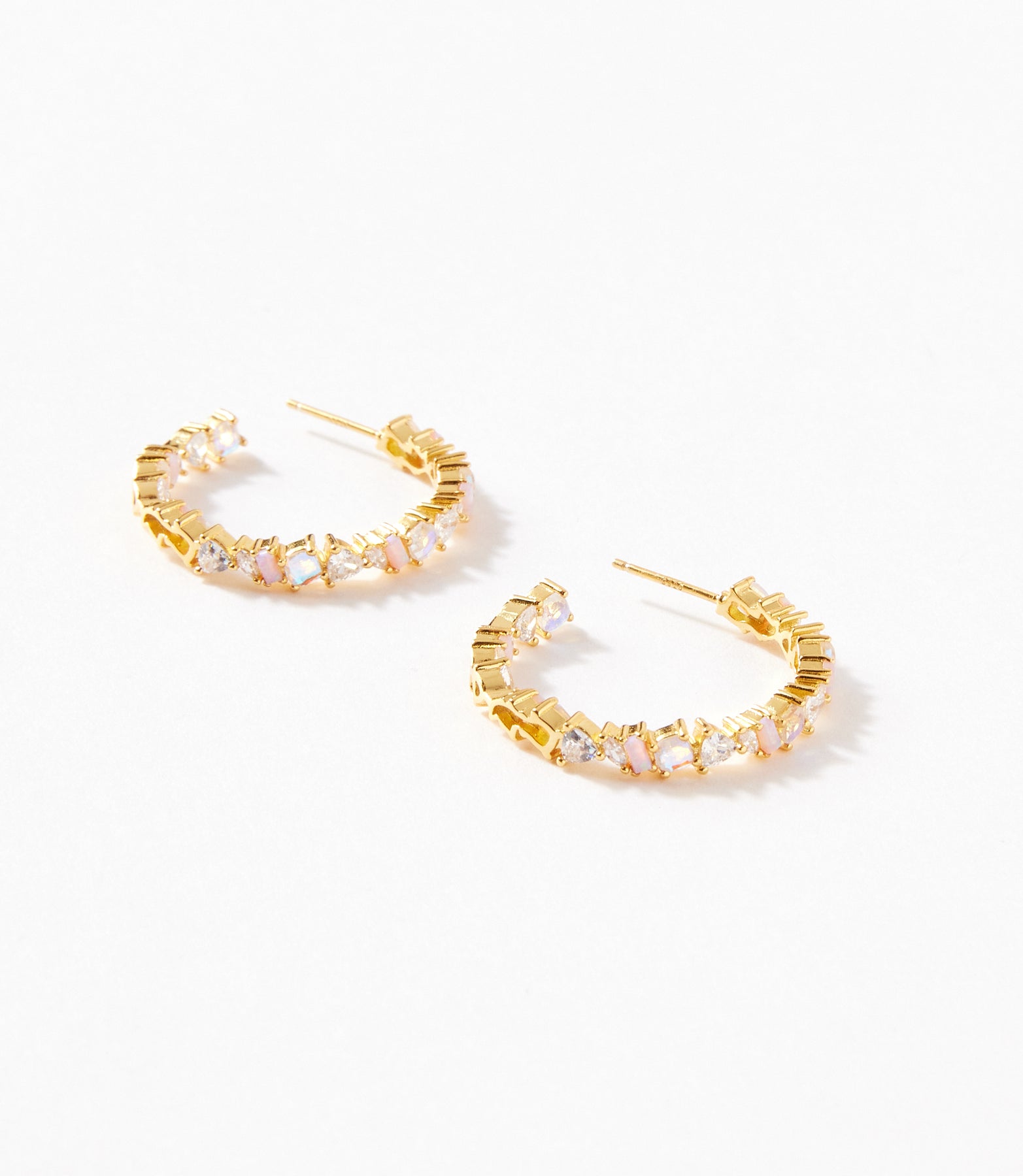 These hoops feature a beautiful array of vibrant pink gemstones, each carefully selected to create a harmonious and eye-catching effect. The combination of soft pink hues and sparkling stones adds a touch of sophistication and fun to any outfit. Lightweight and comfortable, these hoops are perfect for all-day wear.