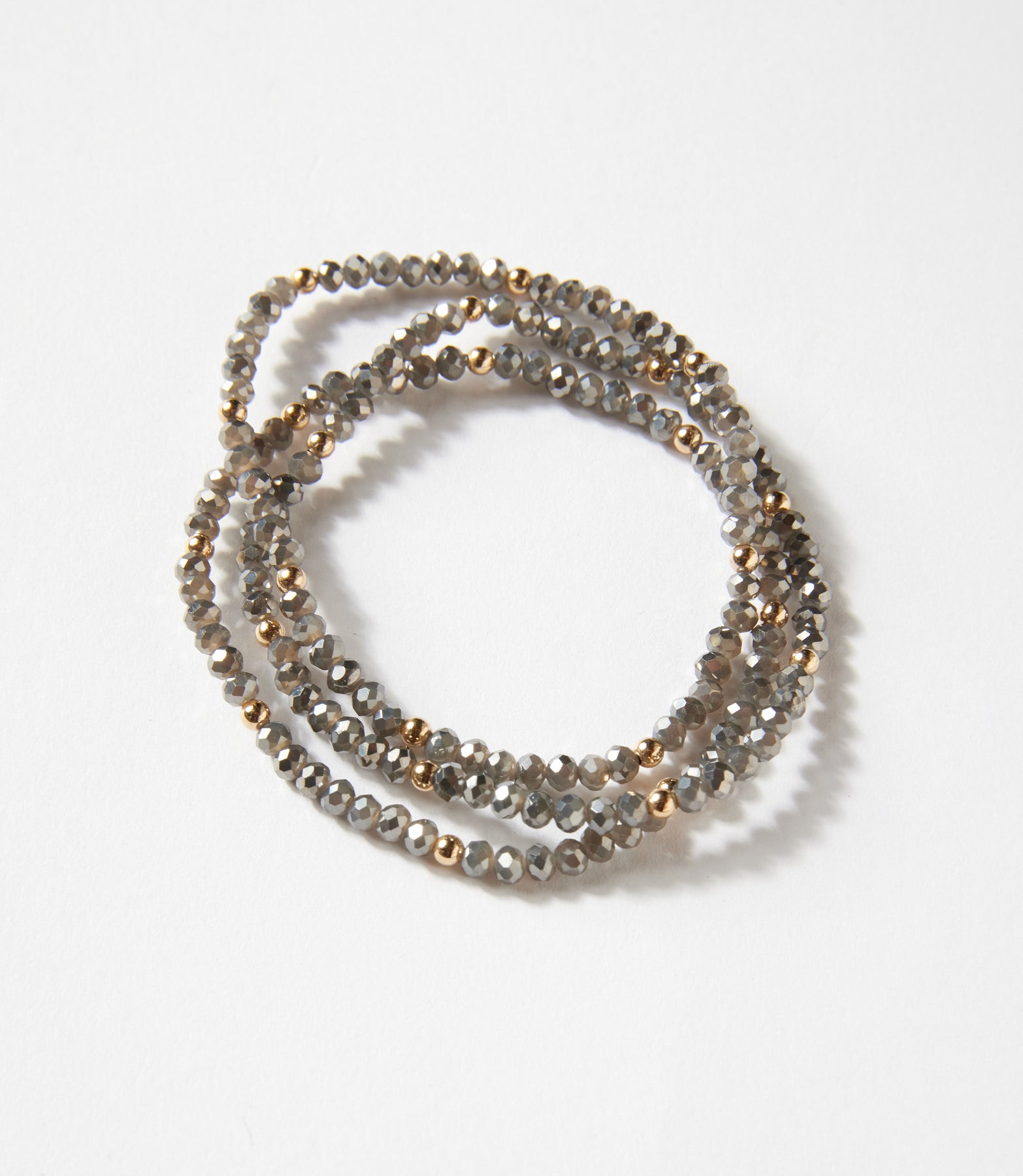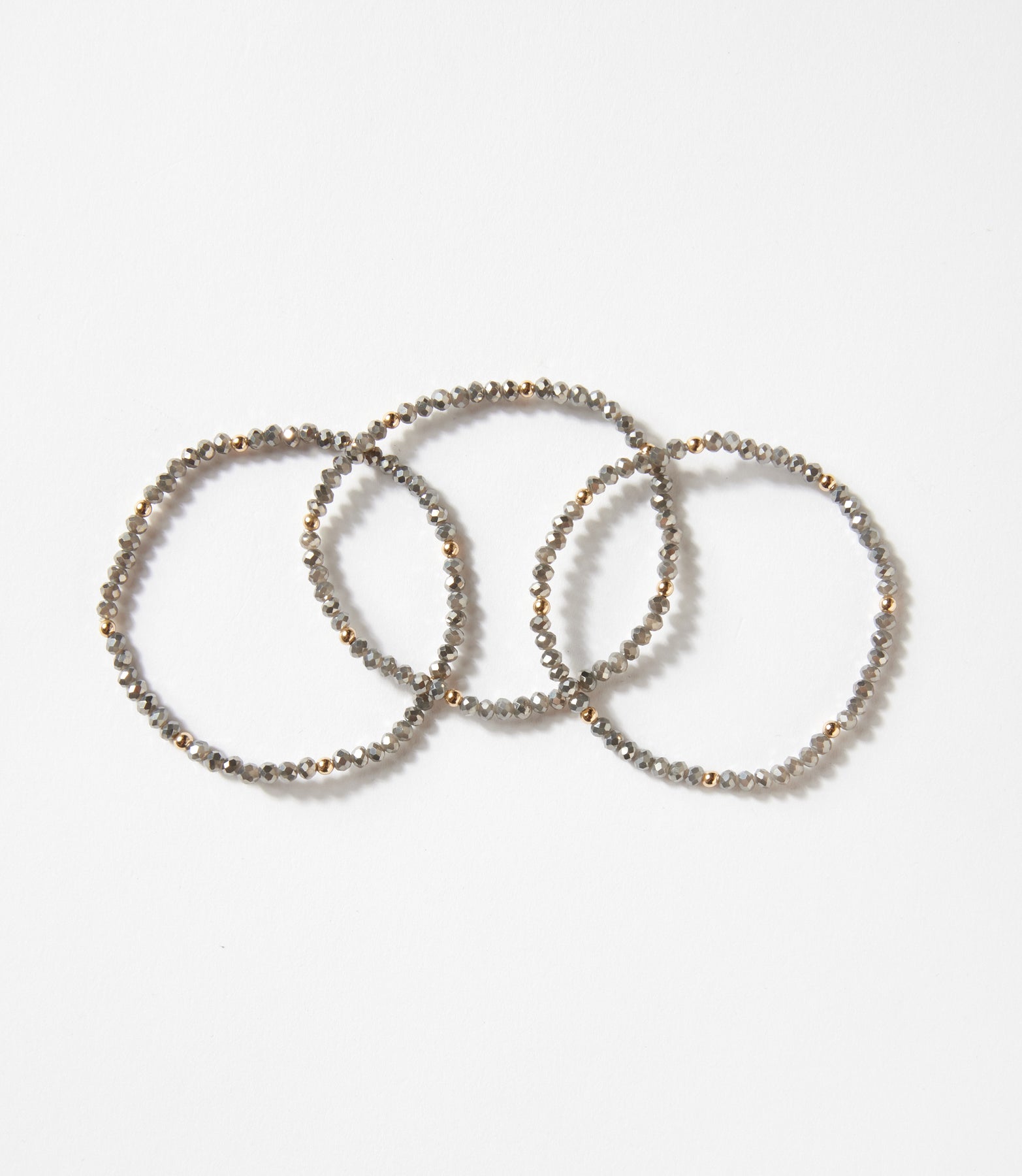 Add a touch of modern elegance with this set of three Beaded Crystal Bracelets. Featuring shimmering light gray glass beads accented with gold-filled details, these bracelets are the perfect blend of subtle sparkle and versatility. With their easy slip-on stretch design, they offer effortless wear — style them stacked together for a chic layered look or individually for a refined hint of shine.