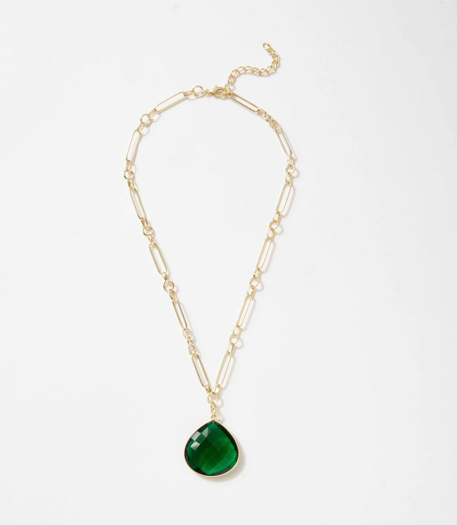 Add a touch of elegance with this eye-catching pendant necklace, featuring a rich emerald green glass stone set in a polished gold-plated brass bezel. The faceted pendant hangs from a stylish paperclip chain, offering a modern yet timeless look. Perfect for layering or wearing solo, this necklace brings a pop of color and refined charm to any outfit.