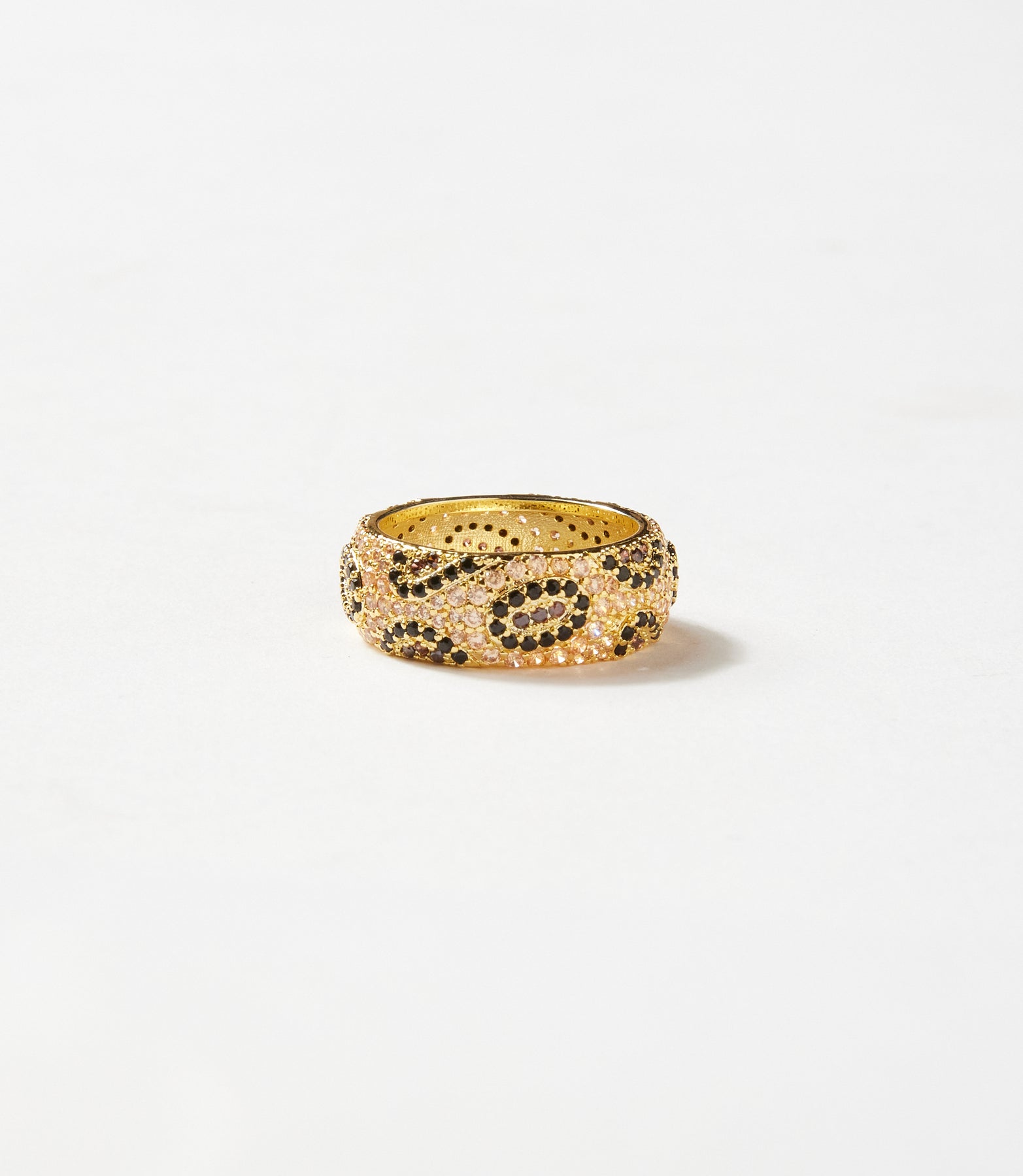 Make a bold statement with this eye-catching gold ring, featuring a leopard-inspired pattern in shimmering cubic zirconia. Crafted from brass with a 14K gold plate, its wide band design delivers maximum sparkle and standout style. Fierce, glam, and ready to shine from every angle. Pair with matching Necklace and Earrings