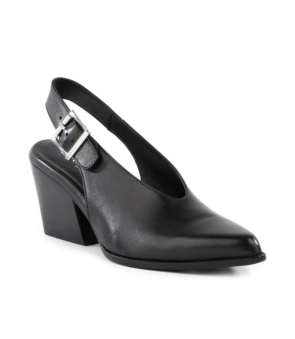 Designed in smooth black leather, this pair features a pointed toe and a bold block heel for the perfect balance of elegance and stability. The adjustable slingback strap ensures a secure fit, while the sculpted silhouette keeps your look sharp and elevated.