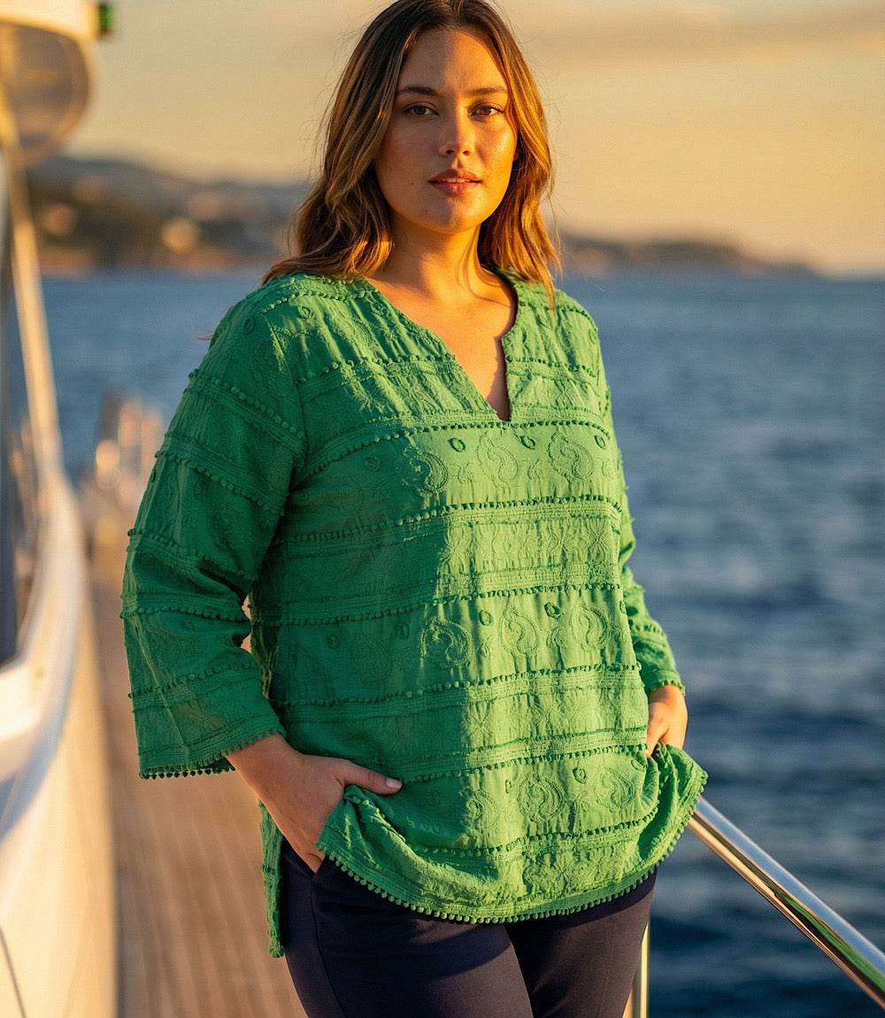 This 3/4 sleeve embroidered tunic features a flattering split neckline, intricate allover embroidery, and an easy pull-on style. Perfectly lightweight and effortless, it blends comfort with chic everyday style.
