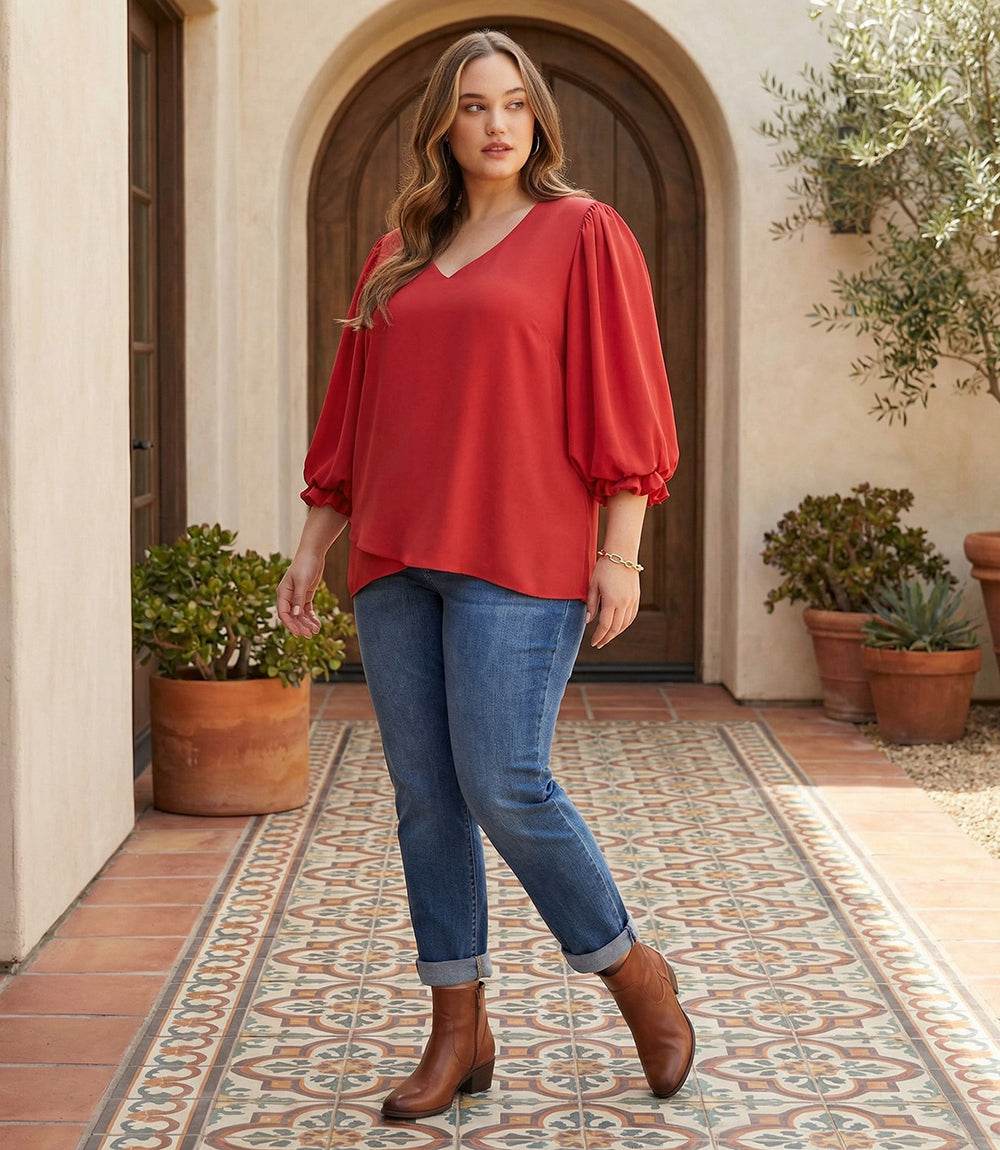 Plus size red V-neck top with bishop sleeves and asymmetrical layered hem