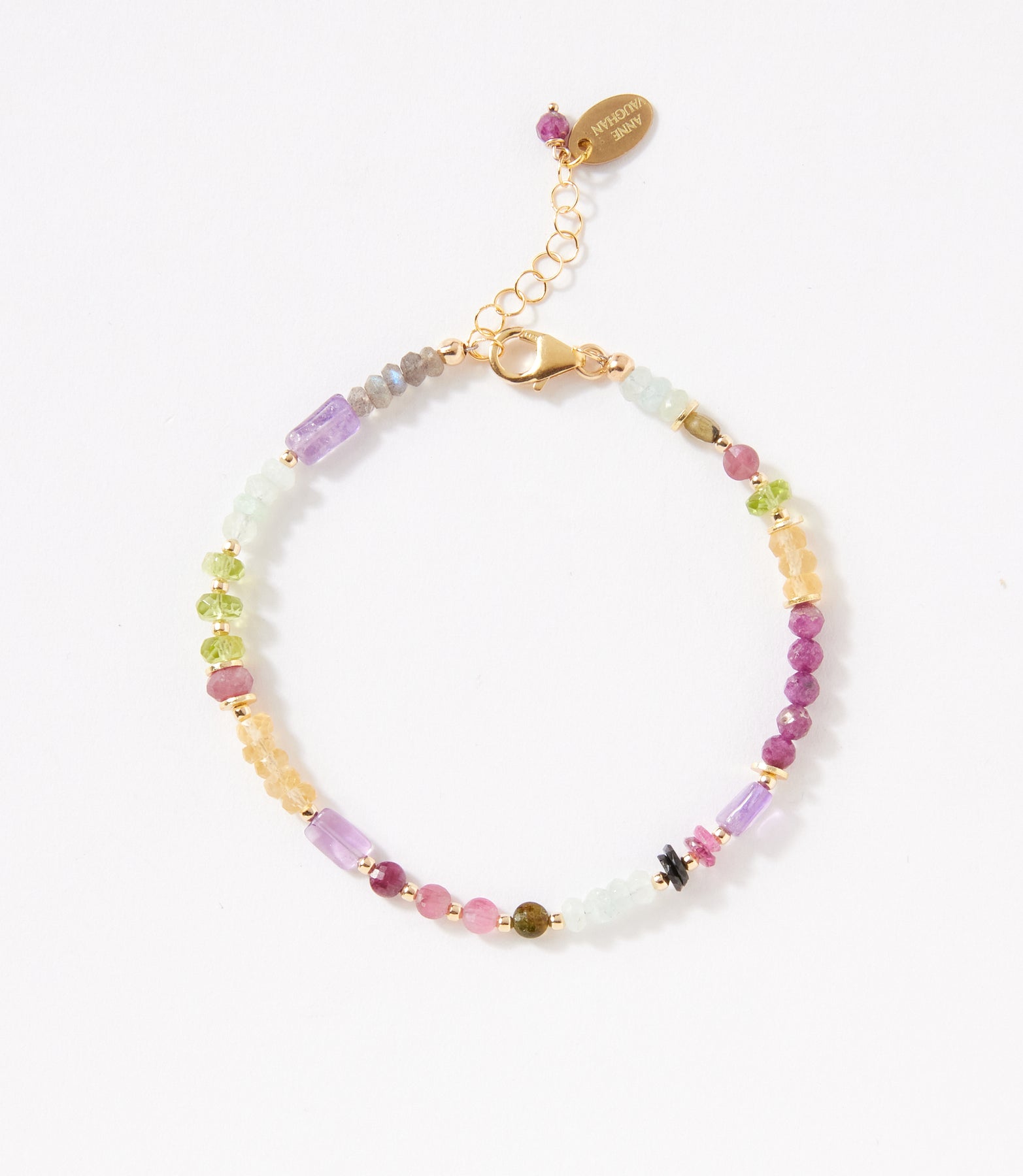 A vibrant mix of multicolored gemstones comes together in this delicate collage bracelet, including labradorite, peridot, ruby, aquamarine, citrine, and tourmaline. Each bead is thoughtfully arranged for a playful yet refined look, accented with gold-filled components. Finished with a secure lobster clasp and a small extender for adjustable sizing. Lead and nickel free for comfortable, everyday wear.