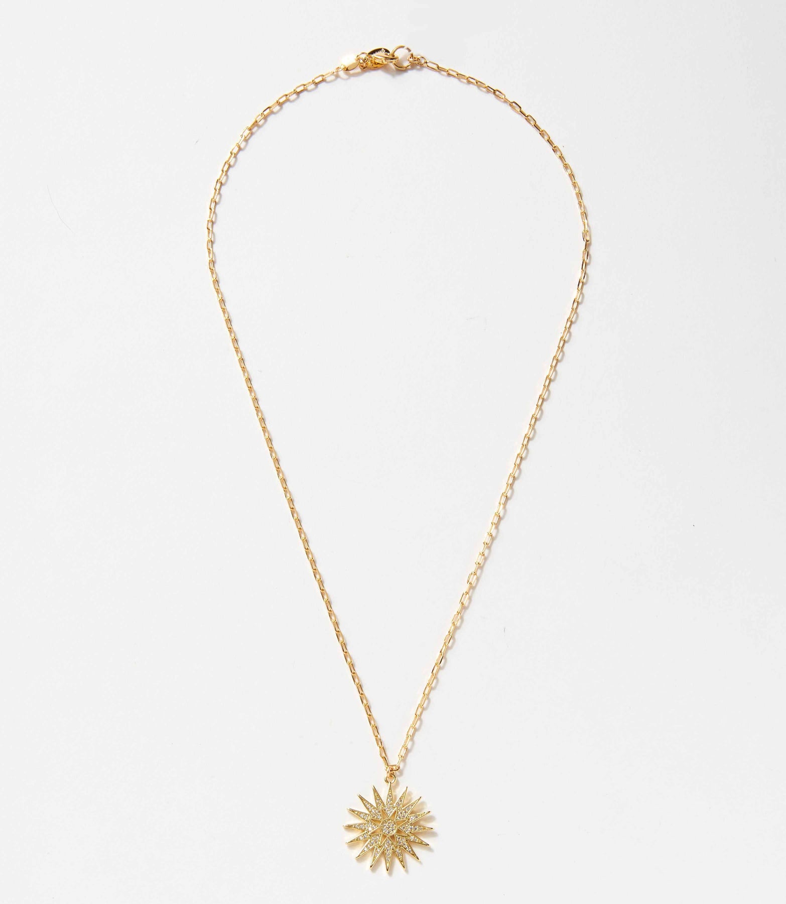 Introducing our exquisite Sunburst Necklace, featuring a dazzling sunburst pendant adorned with sparkling micro pave stones and pave crystals. Elevate your style with this statement piece, perfect for any occasion. Experience the radiance and luxury of our sunburst necklace today.