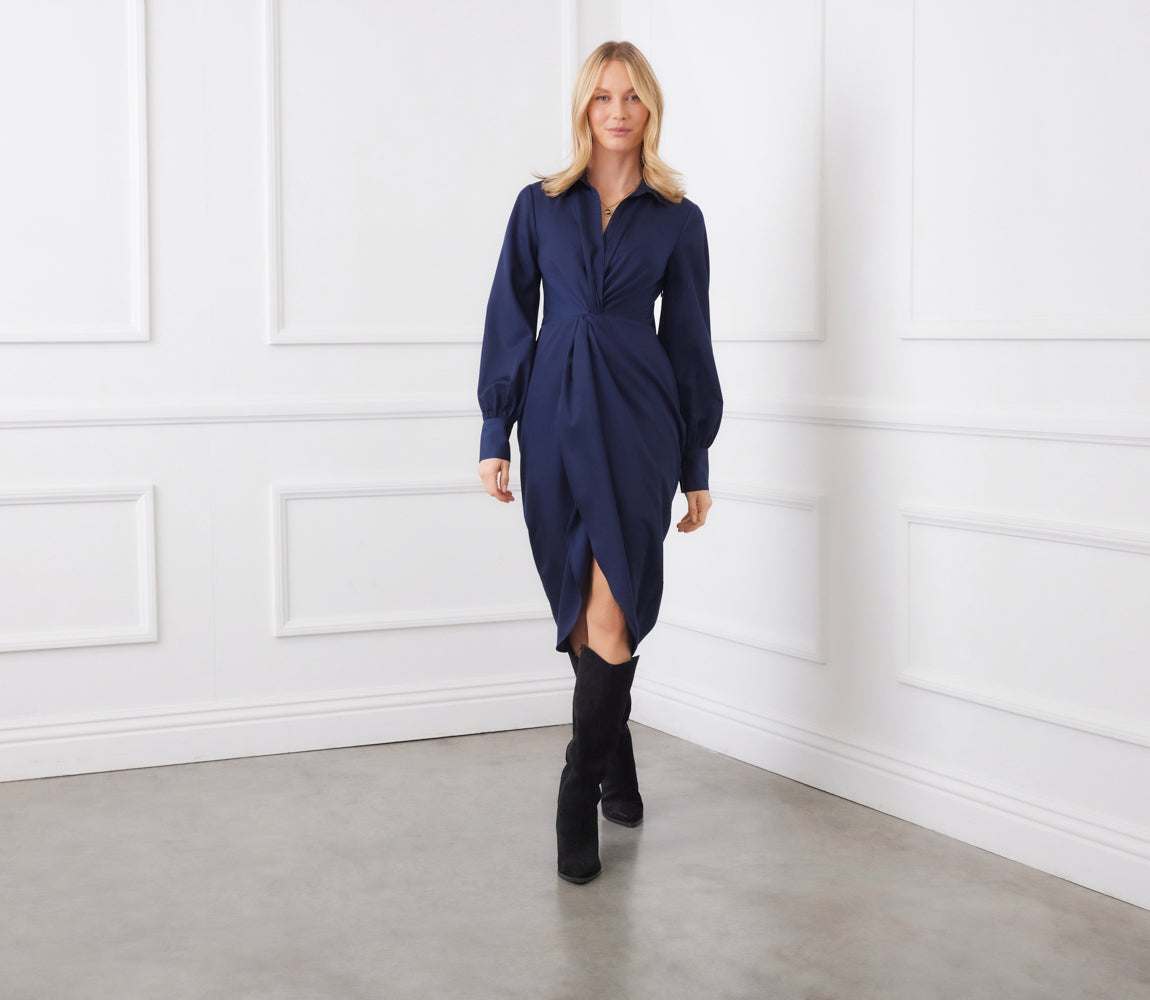 Elevate your look with this sophisticated midi dress, crafted from smooth satin-woven fabric for a subtle sheen. Designed with long sleeves and a classic collar, it features a flattering twist-front detail that creates a beautifully draped silhouette. The tulip hem adds a soft, feminine touch, making it perfect for both day and evening occasions.