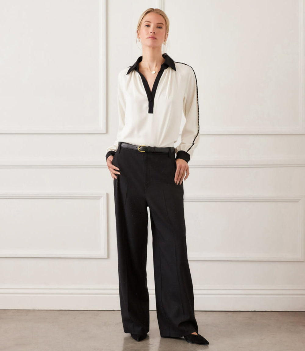 Effortlessly chic with a touch of sparkle, these full-length woven trousers are designed to elevate your look. The wide-leg silhouette creates a modern, elongating effect, while delicate rhinestone embellishments add subtle shine throughout. Thoughtful details include functional belt loops, side pockets, a button-and-zipper closure, and an elastic waistband at the back for a comfortable yet polished fit.