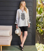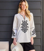 3/4 sleeve embroidered white cotton tunic with black floral embroidery and split neck, relaxed fit for casual wear