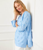Woman wearing a light blue 3/4 sleeve embroidered tunic with split neck and relaxed fit