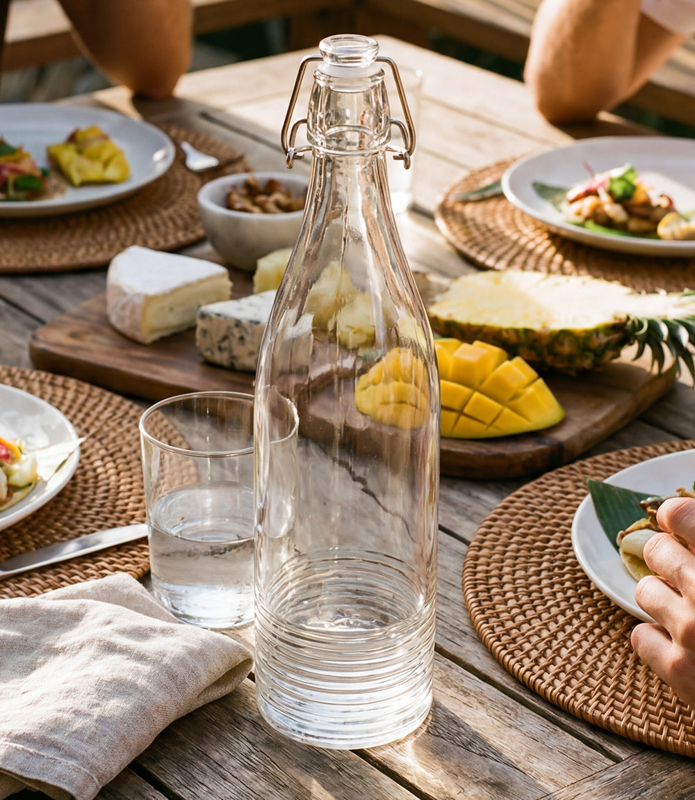 The modern look of our Santorini bottle, featuring its vintage soda pop bottle closure, makes it the perfect table companion to our Santorini glassware pieces. Our glassware offers exceptional clarity and durability, making it ideal for both indoor and outdoor entertaining.