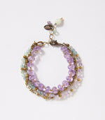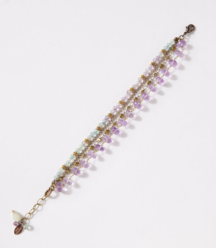 This multistrand bracelet showcases rich amethyst as the focal point, complemented by soft fluorite accents and antique brass details. Gold-tone spacers add warmth, while a small extender and secure antique brass lobster clasp ensure an adjustable, comfortable fit. Crafted without lead or nickel for all-day wear.