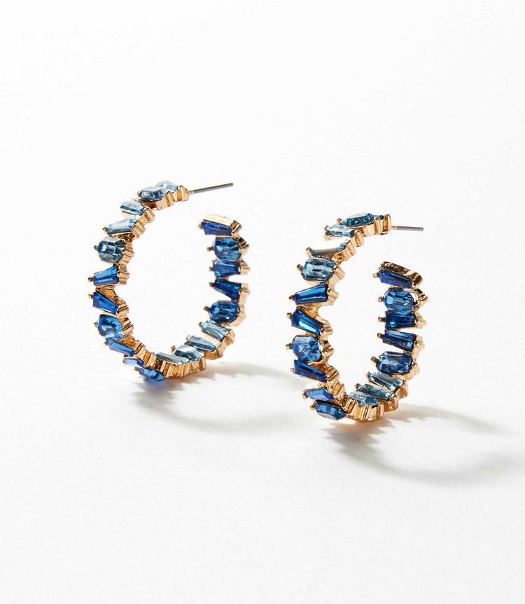 Elevate your look with these stunning blue crystal hoop earrings. The perfect addition to any outfit, these earrings catch the light for a captivating effect. A must-have for any jewelry collection.
