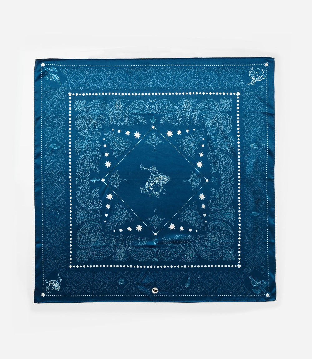 A modern take on the traditional silk bandana, the Banditos Silk Scarf blends classic Western style with a subtle out-west edge. Designed with bronc riders featured in each corner and cactus detailing around the border, this scarf is crafted from luxurious satin silk for a refined finish.