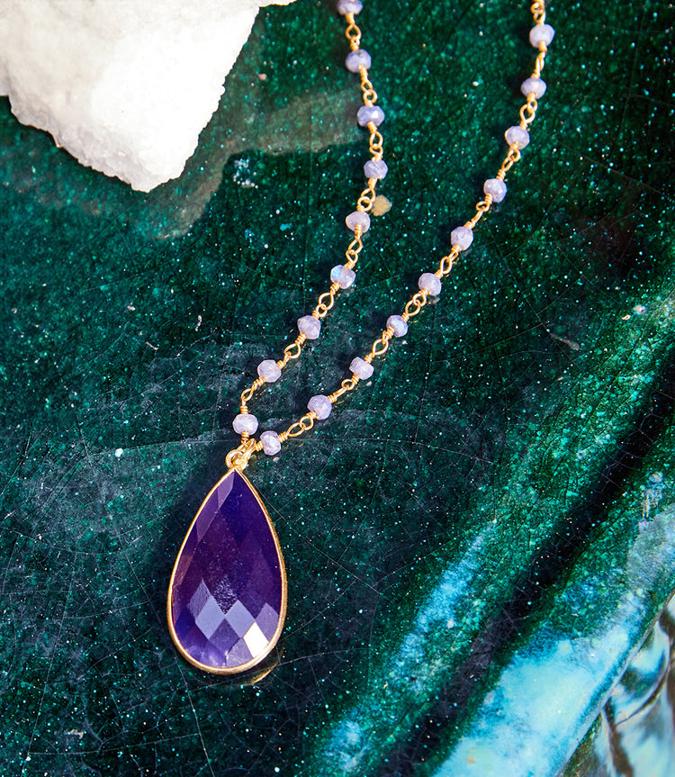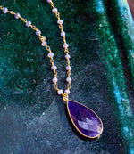 This necklace features a faceted amethyst teardrop pendant suspended from a strand of delicate matching beads. The rich purple tones add a regal touch, making it a perfect piece to dress up any outfit with effortless charm.