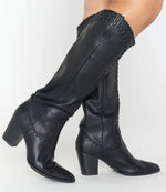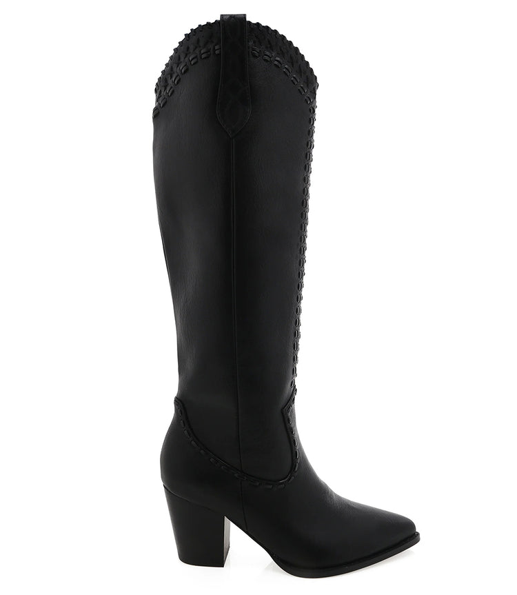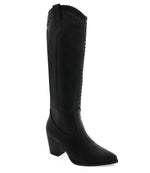 The Billini Finley Boots in black blend modern edge with signature Western flair. Designed with soft pointed toes and bold stitching along the upper, they feature a tall shaft and refined silhouette for a standout look. The mid-height block heel offers subtle lift with all-day comfort, while oversized pull-on tabs make them easy to slide on and go.