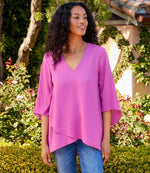 Woman wearing a pink Bracelet Sleeve Asymmetric Top with V-neck and layered hem outdoors