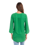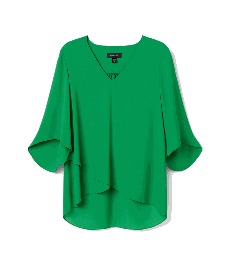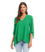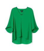 Woman wearing green silky crepe Bracelet Sleeve Asymmetric Top with V-neck and layered asymmetrical hem