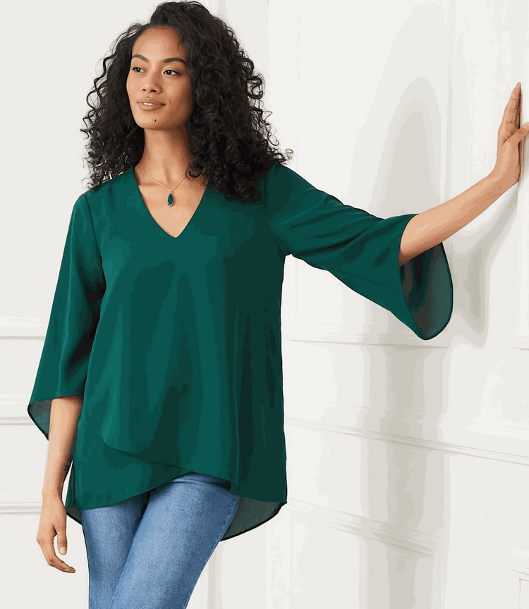 Woman wearing petite size green bracelet sleeve asymmetric top with V-neck and layered hem