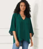 Petite asymmetric top with bracelet sleeves, silky crepe fabric, V-neck, and layered hem in dark green.