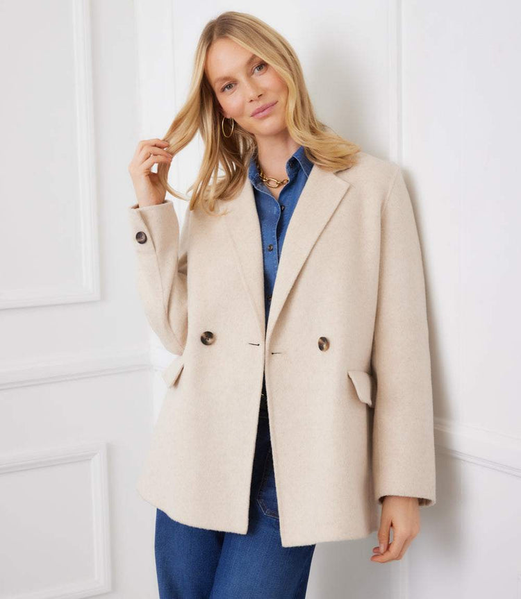 This brushed coating double-breasted coat features a notched collar, 2 x 1 tortoiseshell-effect button front closure, and two front pockets. Crafted with a wool-blend fabric, its tailored silhouette and refined details make it a timeless outerwear piece that combines warmth and sophistication.