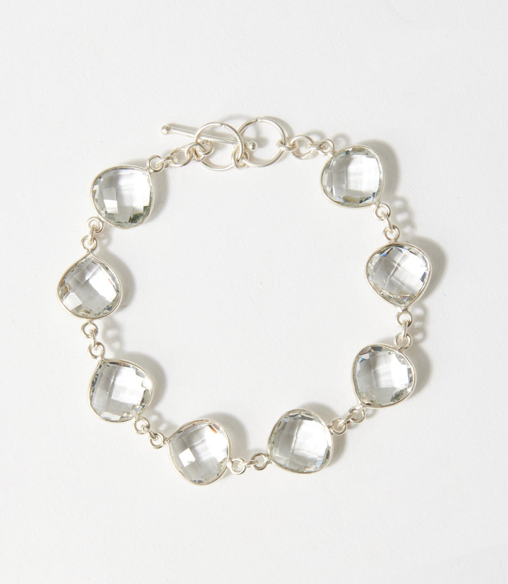 The Crystal Quartz Bracelet in silver is a timeless piece with luminous appeal. Featuring faceted crystal quartz stones set in polished silver-tone settings, this elegant design catches the light beautifully with every movement. Finished with a classic toggle closure, it offers both security and a refined, effortless finish.