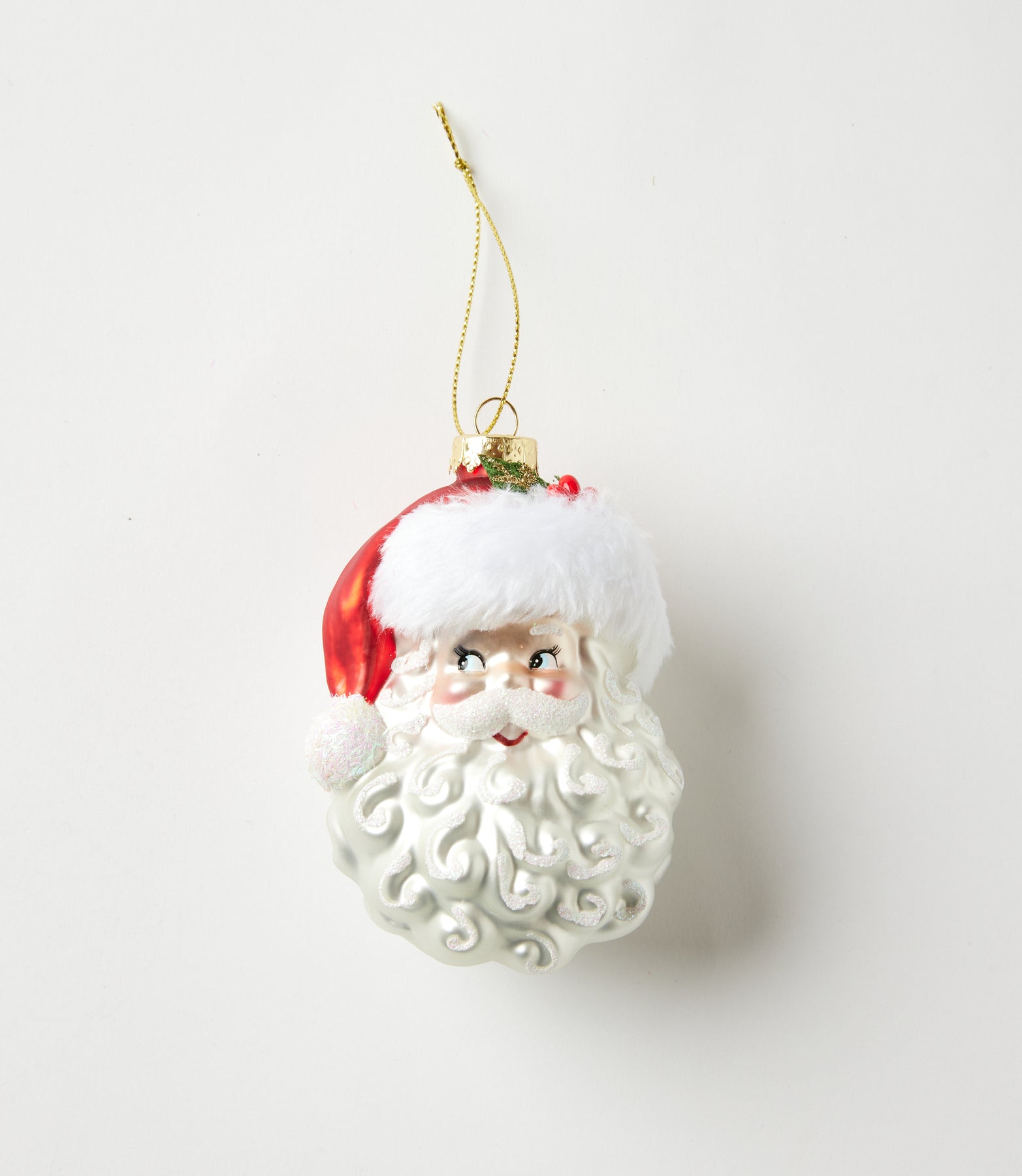 Add a cheerful sparkle to your tree with the Curly Beard Santa Glass Ornament. Made of glass, this festive piece features Santa with a bright smile, a fluffy white beard of soft curls, and a classic red hat trimmed with holly.