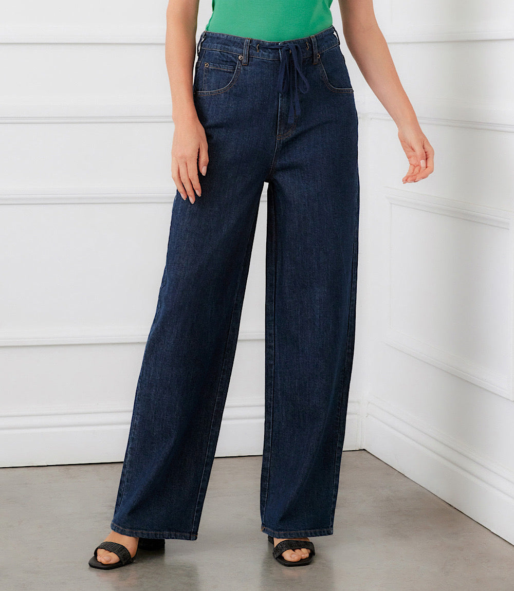 These denim drawstring wide-leg pants combine everyday comfort with effortless style. Crafted in a lightweight denim, they feature a drawstring plus button-and-zipper closure, a relaxed wide-leg silhouette, and classic pocket detailing. The full-length design adds an easy, elongating finish—perfect for all-day wear.