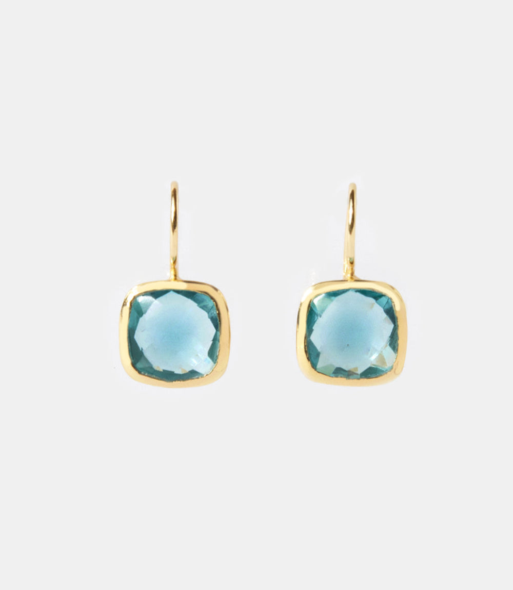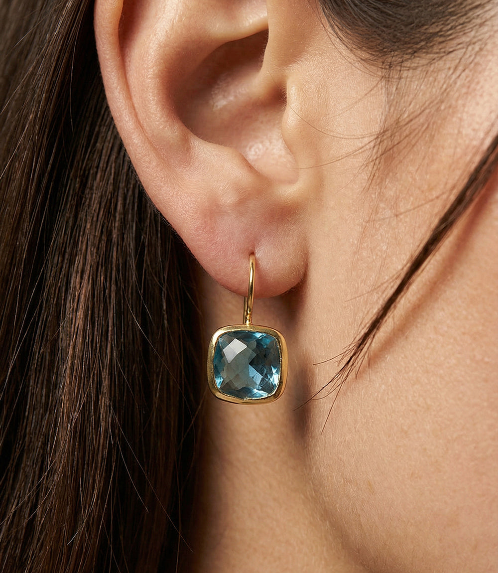 Dolce gemstone drop earrings featuring blue iolite stones set in a smooth gold-plated frame. Designed with elegant hooks, these earrings offer a soft aqua-blue shimmer and timeless simplicity, perfect for everyday wear or effortless dressing up.