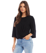 Woman wearing black drape front top with twist seam, bell sleeves, and crew neck paired with light blue jeans