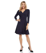 Woman wearing a navy Faux Wrap Drape Dress with 3/4 sleeves and surplice neckline standing against a neutral background