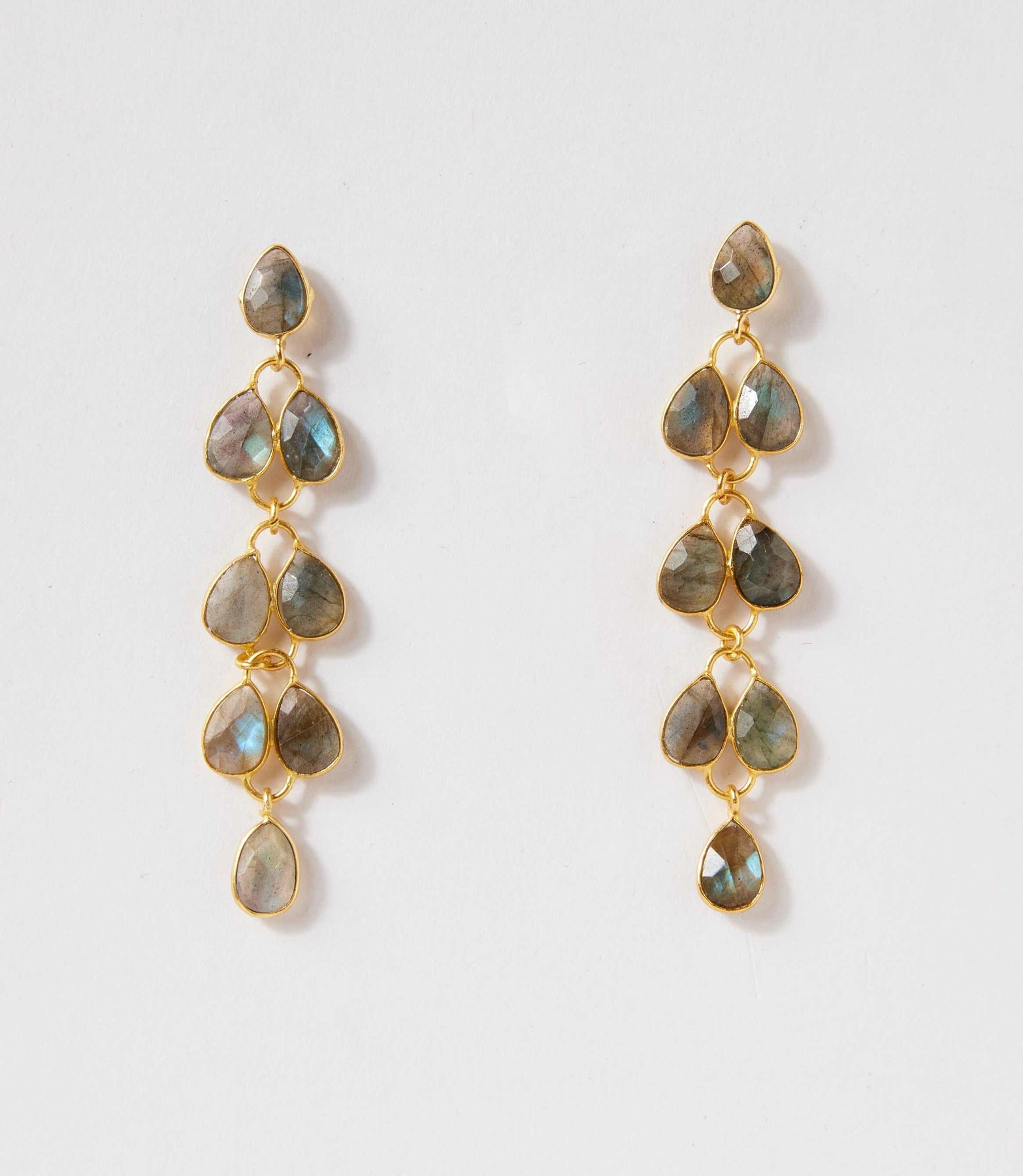 Woman wearing gold-plated feather drop gemstone earrings with mother of pearl stones