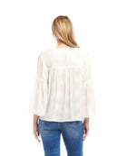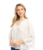 Featuring delicate pintuck pleats and intricate embroidery, this top blends classic sophistication with a modern twist. The flowy flare sleeves offer a graceful, feminine silhouette, while the lightweight fabric ensures comfort from day to night. Perfect for adding a touch of texture and artistry to any outfit, this top is ideal for both casual outings and more polished occasions.