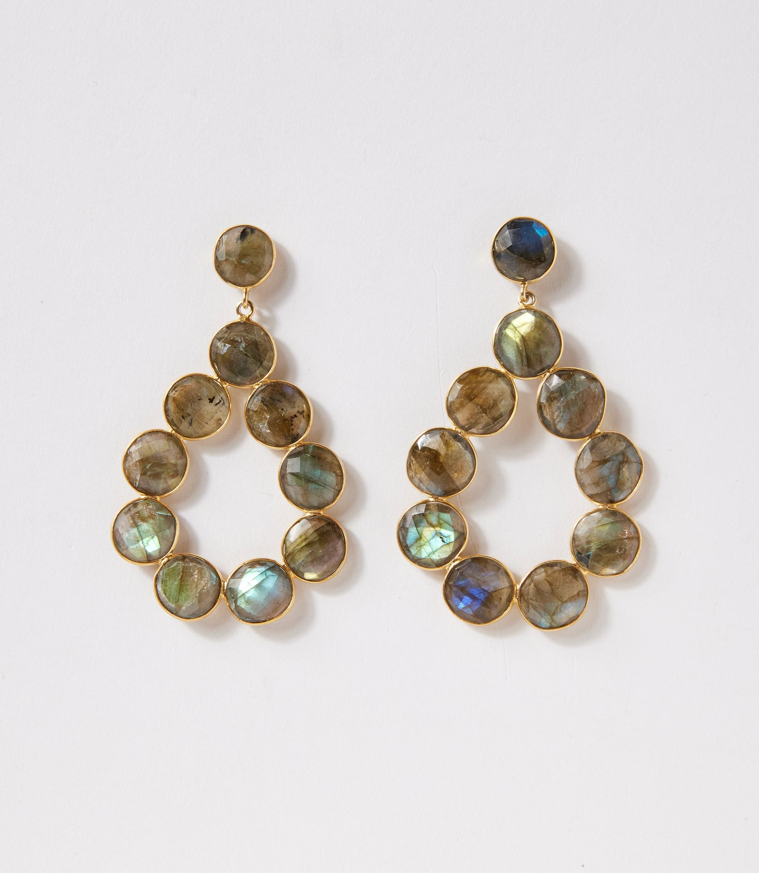 Featuring captivating labradorite gemstones set in a sleek bezel design, these earrings bring a refreshing and elegant touch to any outfit. The soft, tranquil hue of the labradorite stones is beautifully complemented by the refined bezel setting, allowing the gemstones to shine with a sophisticated glow.