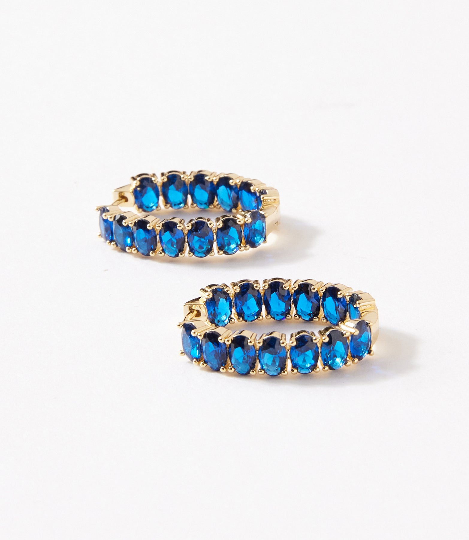 Crafted to perfection, each hoop is adorned with sparkling sapphire-blue gemstones that exude timeless beauty and luxurious color. The rich, deep blue stones are set to catch the light and add a brilliant pop of color to your look.