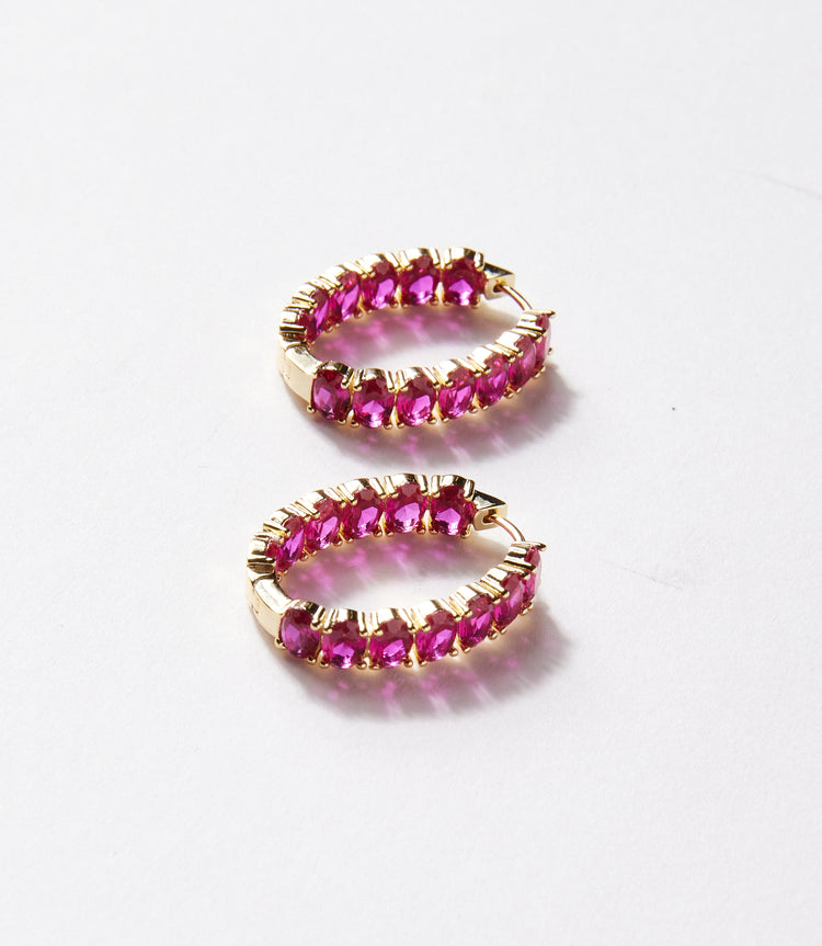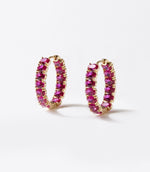 Designed to add a rich pop of color to any look. Featuring radiant ruby gemstones delicately set along sleek oval-shaped hoops, each pair glows with deep red brilliance and refined elegance. Crafted with a mix of gold-filled, gold vermeil, and sterling silver elements, these earrings strike the perfect balance of sophistication and everyday charm.
