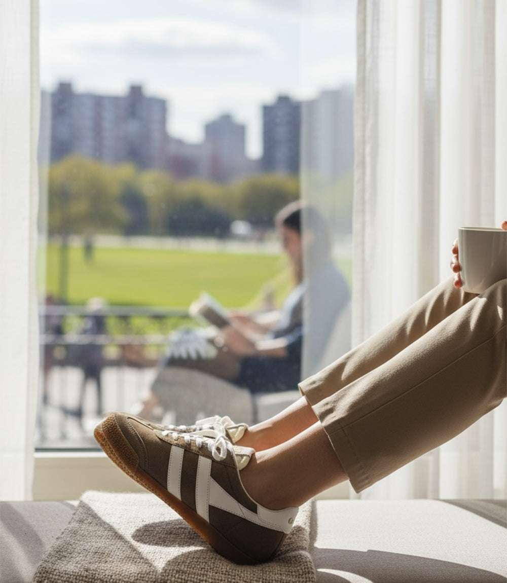 Gola Elan Classic Sneakers in mocha suede with white stripes and gum sole worn outdoors