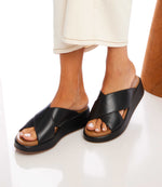 Key Largo Slip On Platform Sandals in black leather with crisscross design and 2-inch platform soles
