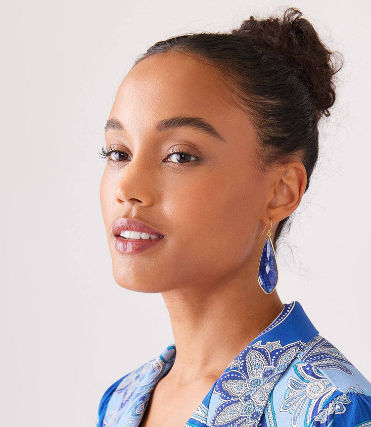 Large natural gemstone kite-shaped earrings with blue stones set in gold-plated sterling silver and drop ear wires