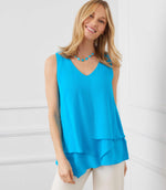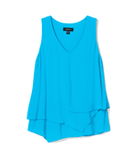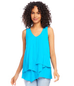 Woman wearing blue sleeveless layered tank top with V-neckline and asymmetric hem
