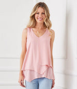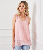 A double-layered front descends into an asymmetric hem bringing stylish dimension to a breezy gauze tank. Whether heading to brunch, a day at the office, or a night out with friends, this layered tank epitomizes style and ease.