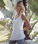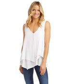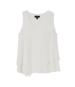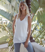A double-layered front descends into an asymmetric hem bringing stylish dimension to a breezy gauze tank. Whether heading to brunch, a day at the office, or a night out with friends, this layered tank epitomizes style and ease.