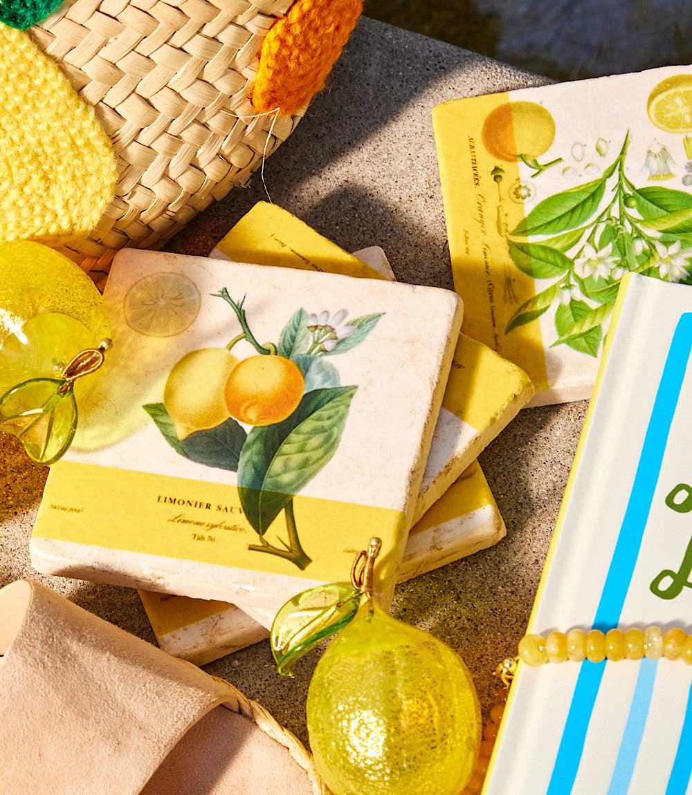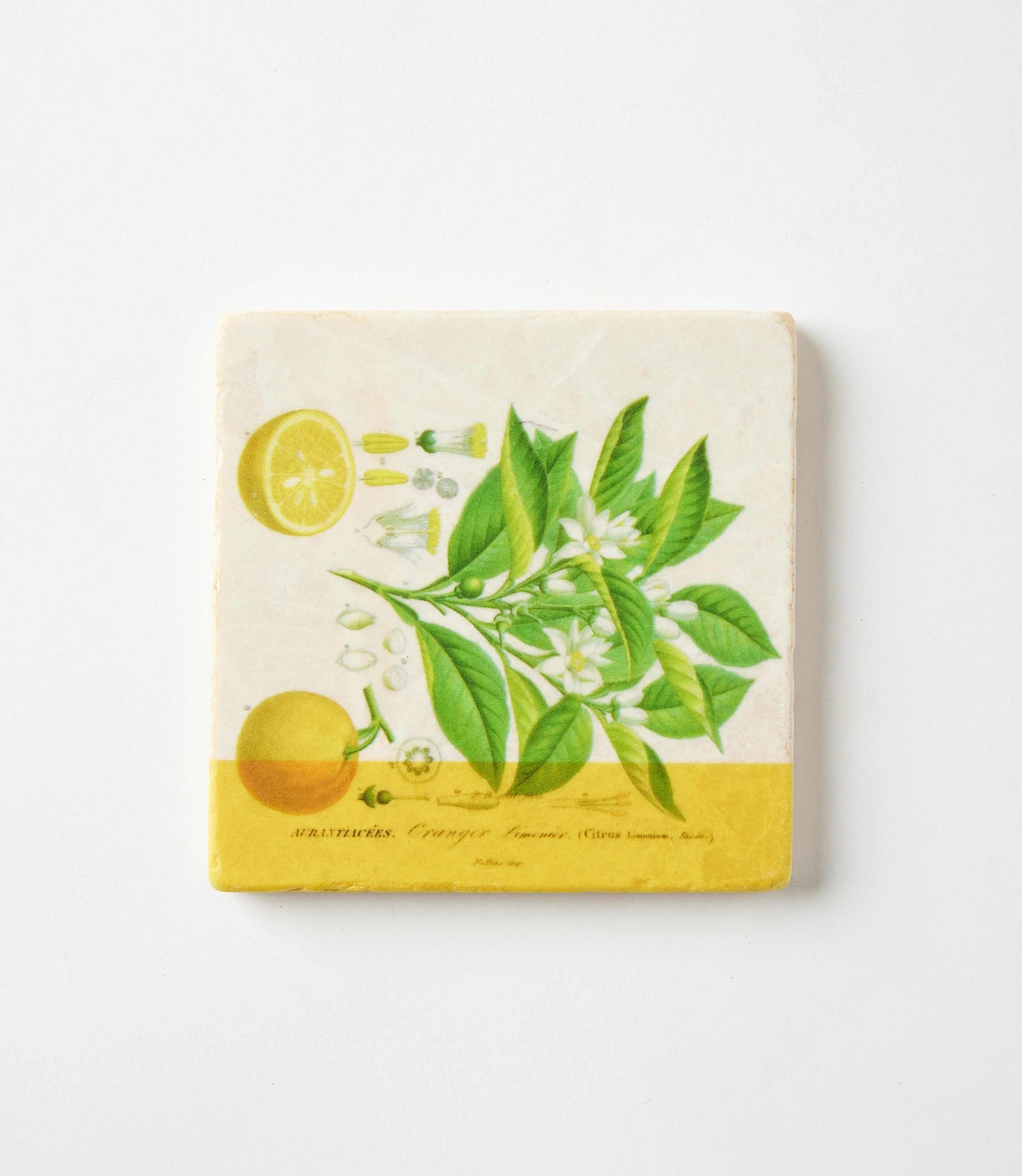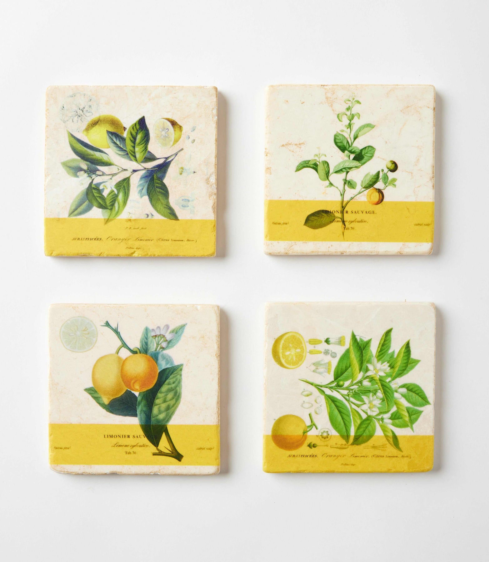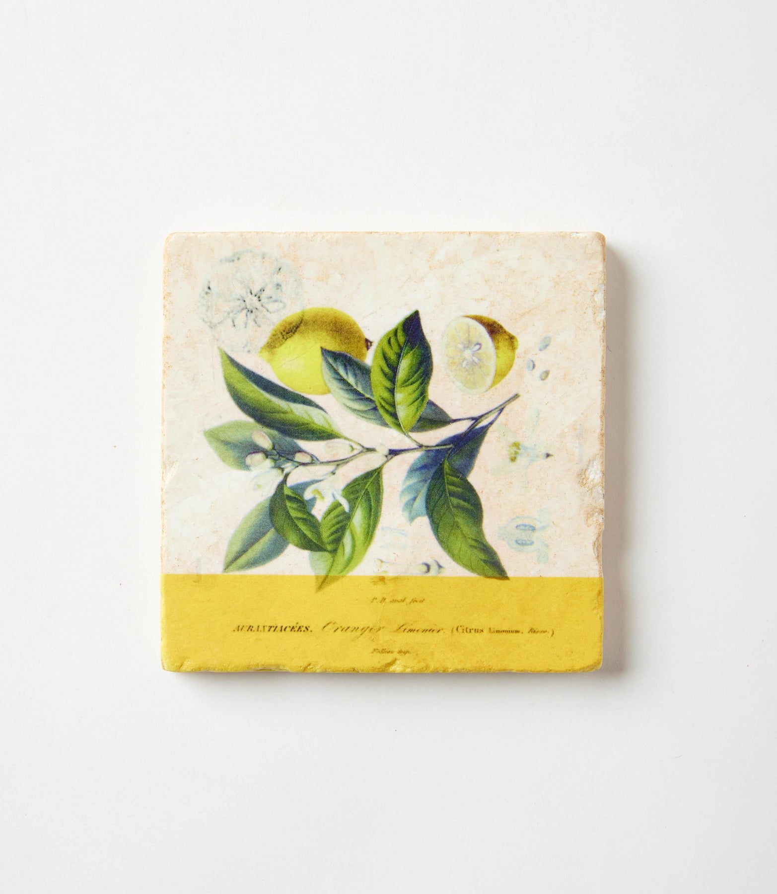 This set of four Lemon Marble Coasters adds a bright, cheerful touch to any table. Handcrafted by trained artisans from natural tumbled stone, each coaster features a vibrant lemon motif on a creamy marble base. With unique veining and subtle texture, natural and vintage variations make every set one of a kind. A corked back ensures surface protection, combining everyday function with sunny, Mediterranean-inspired charm.