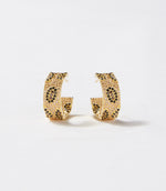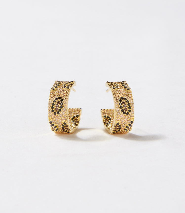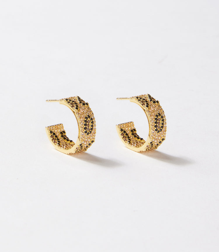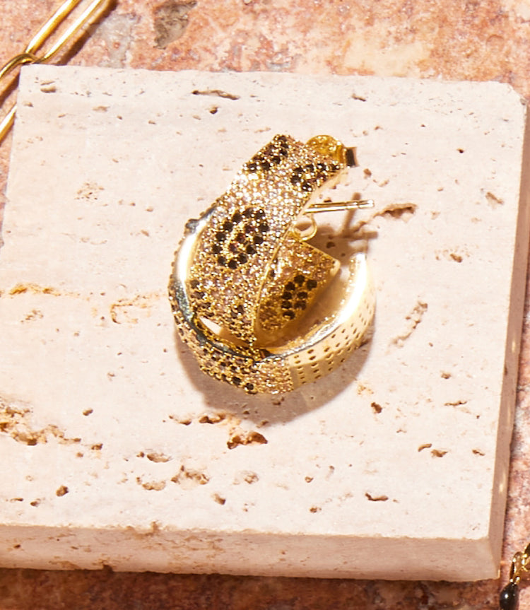 Fierce meets glam in these bold hoop earrings, featuring a leopard-inspired crystal pattern set in a wide gold-tone band. Crafted from brass with a 14K gold plate and encrusted with shimmering cubic zirconia, they add instant edge and sparkle to any look. Pair with matching Necklace and Ring