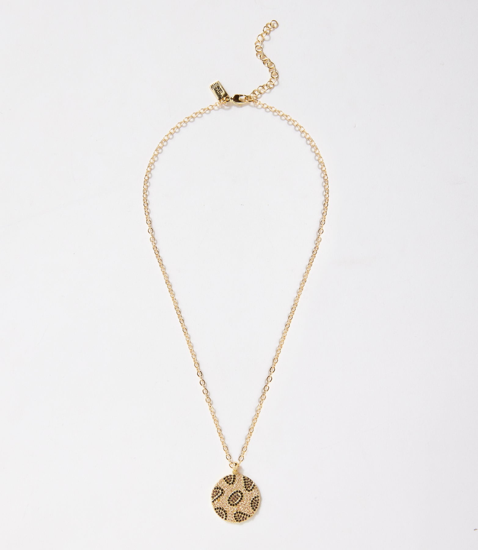 Featuring a round pendant encrusted with shimmering cubic zirconia in a bold leopard pattern, this necklace brings glam and edge together effortlessly. Crafted from brass with a 14K gold plate, it delivers a luxe finish perfect for layering or wearing solo. Pair with matching Earrings and Ring