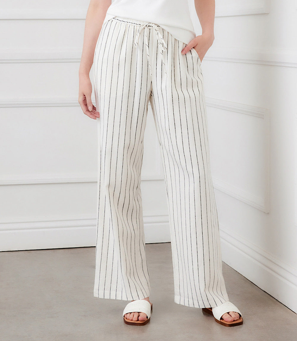 These linen-blend striped pants feature a breezy wide-leg silhouette, side pockets, an adjustable drawstring waist, and effortless pull-on comfort—perfect for warm, easygoing days.