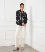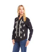 Black long sleeve embroidered shirt with cream floral and paisley embroidery, button front, and collared neckline worn by smiling woman