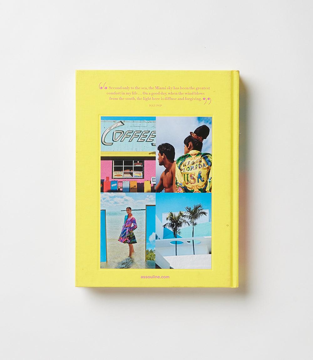 Bright yellow hardcover coffee table book titled Miami Beach with blue palm leaf graphic being held by hands against colorful background