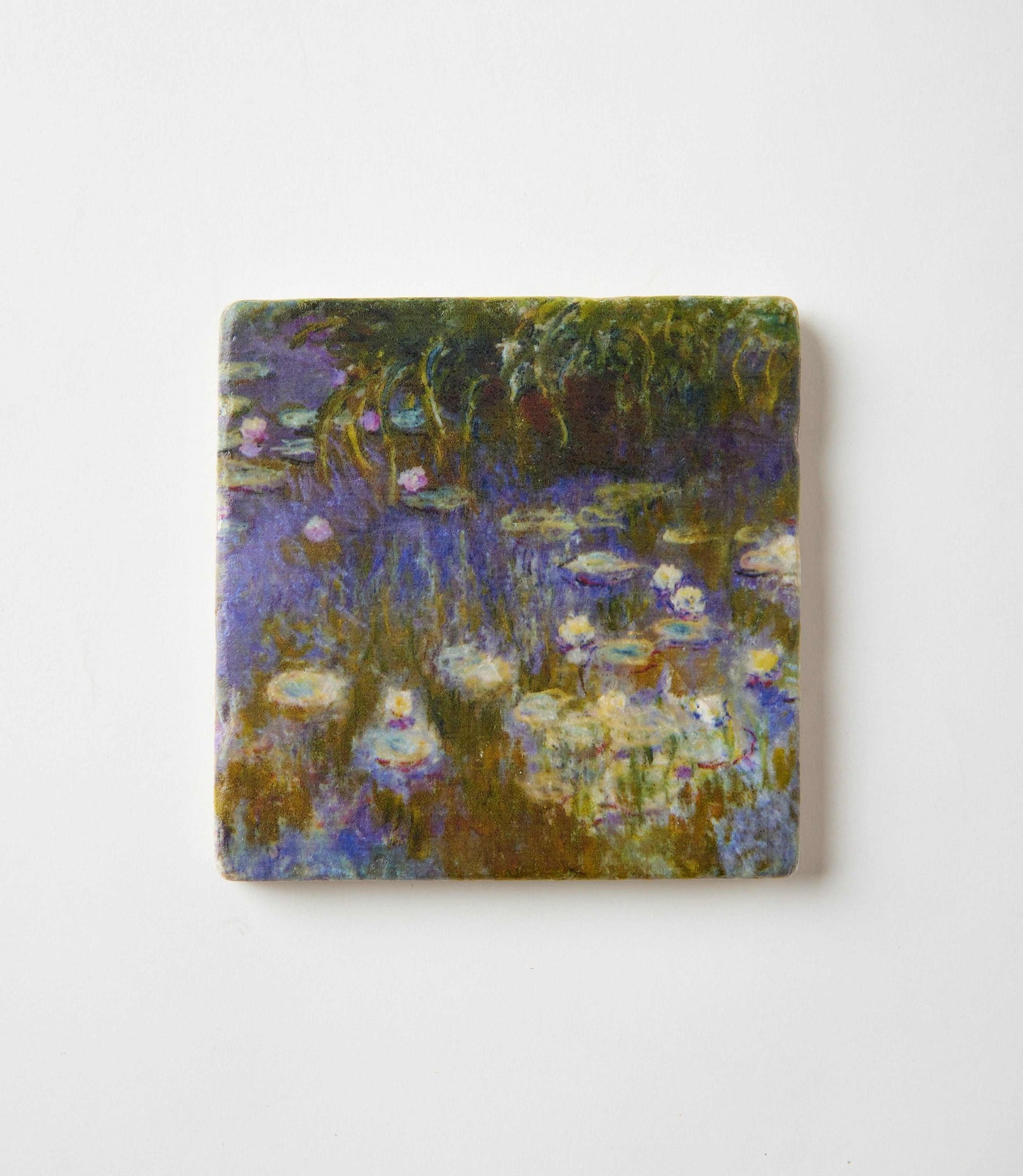 Bring the beauty of Impressionist art to your home with this set of four tumbled marble coasters featuring serene water lily scenes. Each coaster captures the artist’s iconic brushwork and vibrant color palette, adding a soft, artistic touch to any surface.