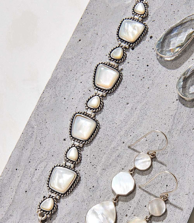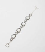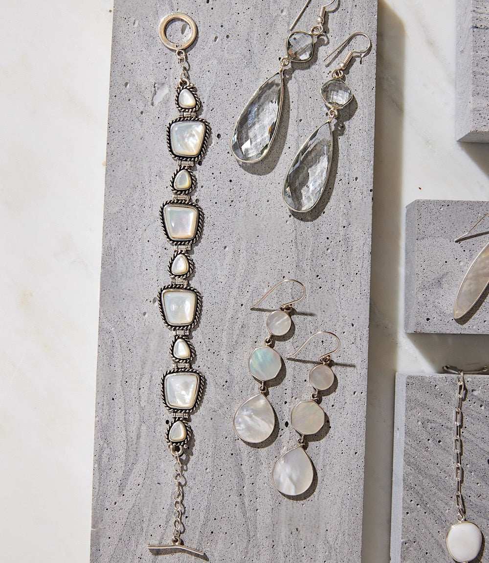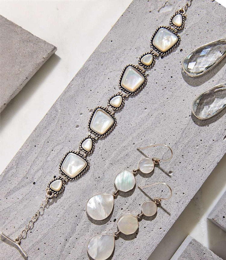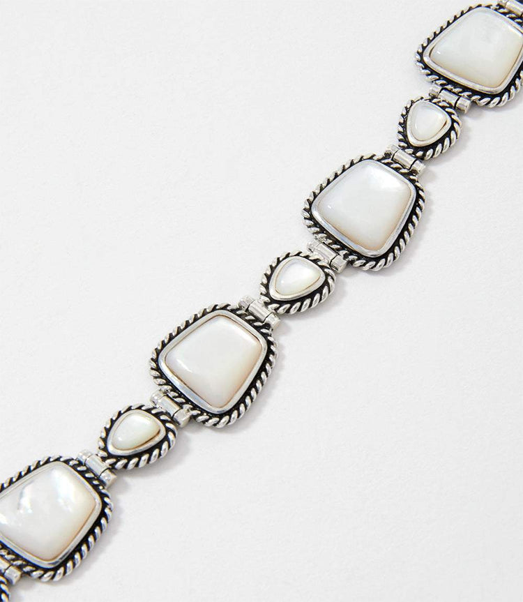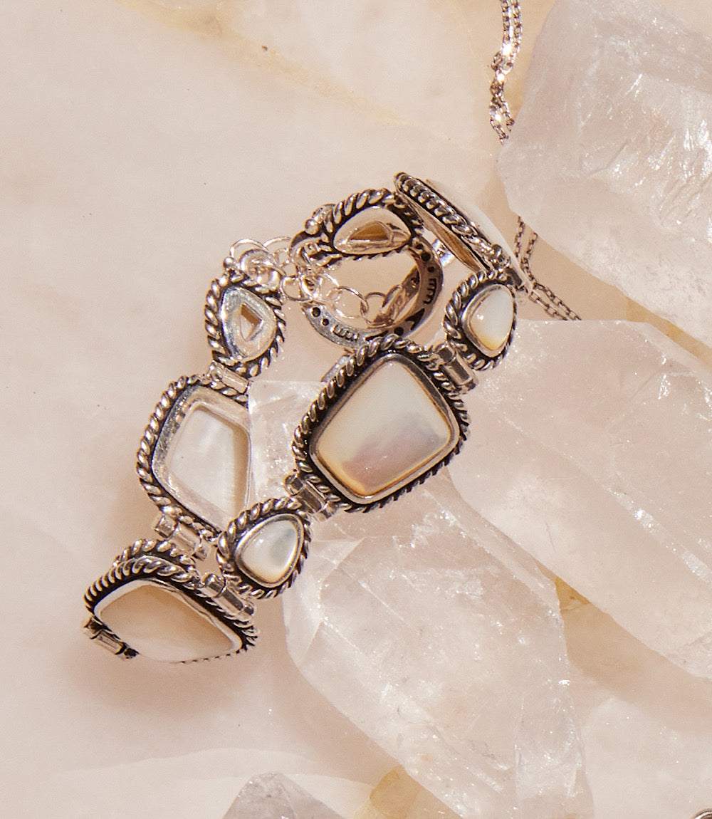This hand crafted Toggle Bracelet showcases genuine mother of pearl stones set in sterling silver. The elegant design adds a touch of sophistication to any outfit. Handmade with care, this bracelet is sure to become a timeless accessory in your collection.